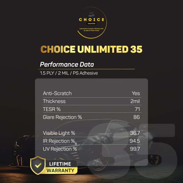 Choice Unlimited is the professionals choice automotive and residential ceramic window film. Choice Unlimited’s optical clarity is among only the most elite films with its extremely low, almost 0, haze and true charcoal black color. This thick flexible 2 mil window film allows for a silk like shrink which also makes proper installation easier. All improvements were made with having the professional tint specialist at any level in mind. Choice Unlimited’s innovative over heat shield technology makes for a perfect window film for everyone, relieving common frustrations for the window tint community’s beginners. The best part? This film comes with a lifetime warranty from fading, color changing, and bubbling leaving you worry free.