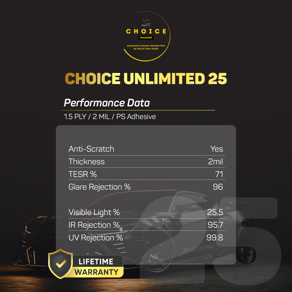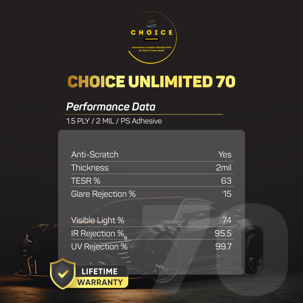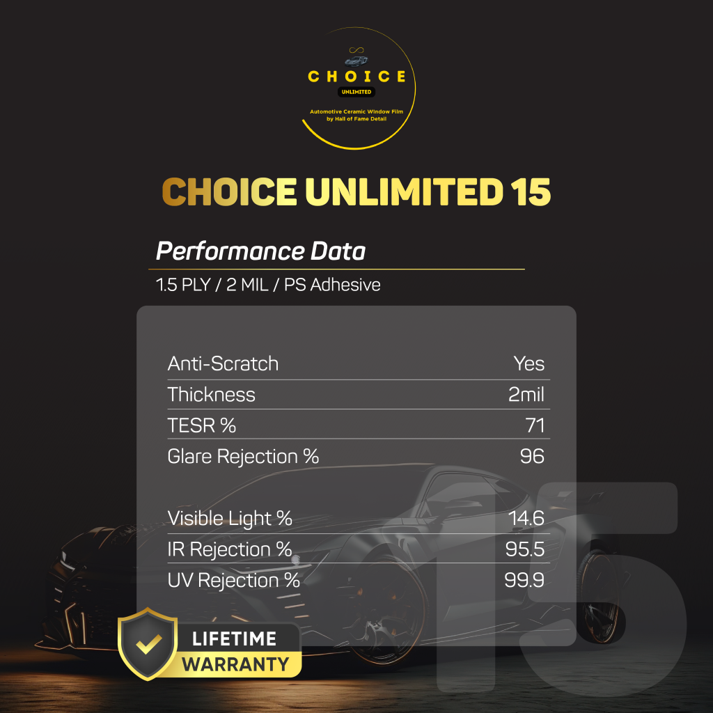 Choice Unlimited Window Film offers exceptional specifications, such as a 95%+ IRR rating, 63% TSER or higher, 99% UV ray rejection, and 96% glare rejection. With unmatched performance and an excellent price point, Choice Unlimited sets the standard for quality in the industry.